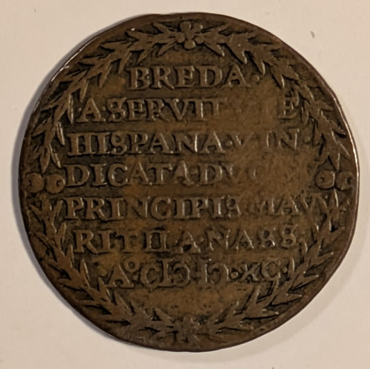 NETHERLANDS, Maurice, Prince of Orange ~ 1590 ~ Copper Jeton 30mm, 5.79g ~ Soldiers disembarking from barge/7 line legend including date in Roman numerals in legend ~ Mitch-2480, VL-V, 409, Dug-3255 ~ VF, museum number in “Indian Ink”