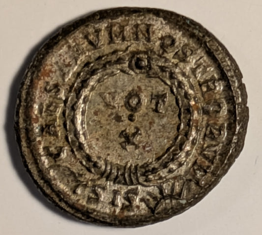 ROMAN EMPIRE, Constantine II 337-340. As Caesar ~ 317-337 (321-325) ~ Silvered Centenionalis (3.28g) ~ Laureate head rt. CONSTANTINVS IVN NOB C ~ CAESARVM NOSTRORVM, VOT X, ΓSIS & radiate sun below. Siscia mint ~ SR-17194, RIC-7, 182; Ch. toned EF