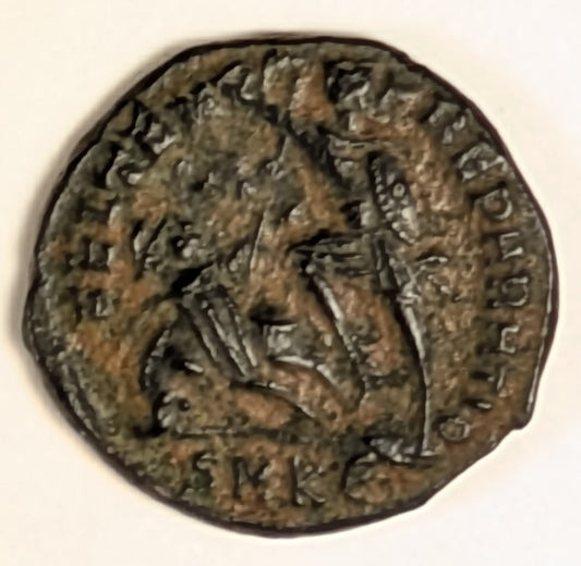 ROME, Constantine II ~ 337-340 ~ Æ4 (2.49g) of Cyzicus ~ Bust right ~ 2 soldiers stg., either side of 1 standard, SMKA in ex, glor iaexer citvs around ~ RIC-27. LRBC-1275 ~ Nice glossy VF