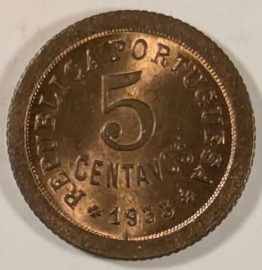 PORTUGUESE GUINEA, One year type ~ 1933 ~ 5 Centavos ~ Liberty head left ~ Denomination and date ~ Y-1, KM-1 ~ Nice R&B unc
