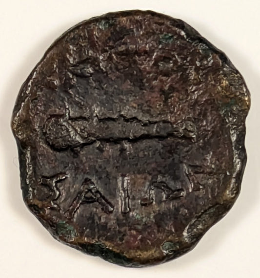 SAMARIA, Neapolis ~ Domitian. 81-96 ~ Æ16 (3.96g) ~ Laureate bust right ~ Two ears of grain on 1 stal, LEI = year 15 = 86/87 AD. Usually seen dated year 11. ~ Ros-6, ~ F, porous, obv. o.c.