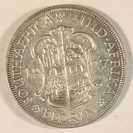 SOUTH AFRICA, Union of So. Africa, Dominion ~ 1927 ~ 1 Florin ~ Crowned bust of George V left ~ Arms divides date. Denomination as FLORIN. ~ Y-20, KM-18 ~ VF/EF