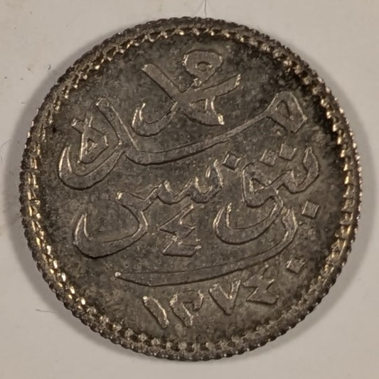 TUNISIA, Abdul Mejid (with Muhammed Bey) ~ AH 1274 (1859) ~ 4 Kharubs ~ Short two year type in high grade ~ KM-135, Cr-121 ~ Lustrous Ch. AU