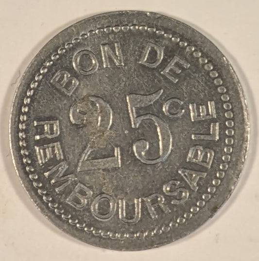 COMOROS, SOCIETE ANONYME DE LA ~ GRANDE COMORE ND (1915) ~ 25 Centimes Aluminum token ~ SOCIETE ANONYME DE LA GRANDE COMORE ~ BON DE REMBOURSABLE 25¢ ~ Lec-21, Gad-4, KN-Tn-1 ~ EF, some porosity