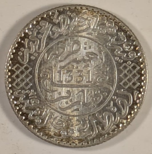 MOROCCO, Yusuf ~ 1331 Paris (1912) ~ 2 1/2 Dirhams (1/4 Rial) ~ One year type in very high grade ~ Y-31, Lec-155 ~ Choice BU