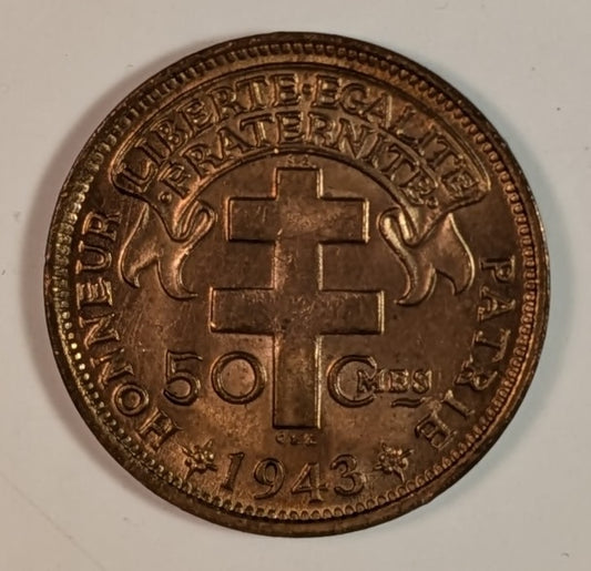 MADAGASCAR, French Colony ~ 1943-SA ~ 50 Centimes ~ Bronze ~ 1 year WW2 type struck in Pretoria, South Africa ~ Y-1, KM-1, Lec-93 ~ Choice Red Unc