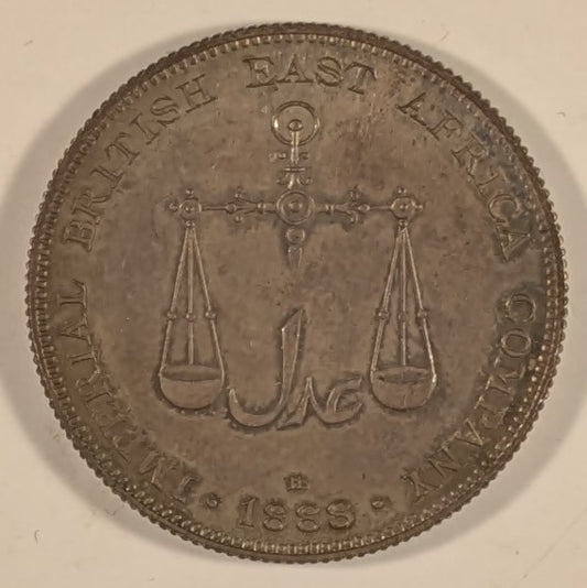 MOMBASA, British Colony ~ 1888-H ~ 1 Rupee ~ Scales above mint mark and date ~ Crown above radiant sun. Struck at Heaton Mint in Birmingham, England ~ Y-5, KM-5 ~ Ch. toned Proof or Specimen