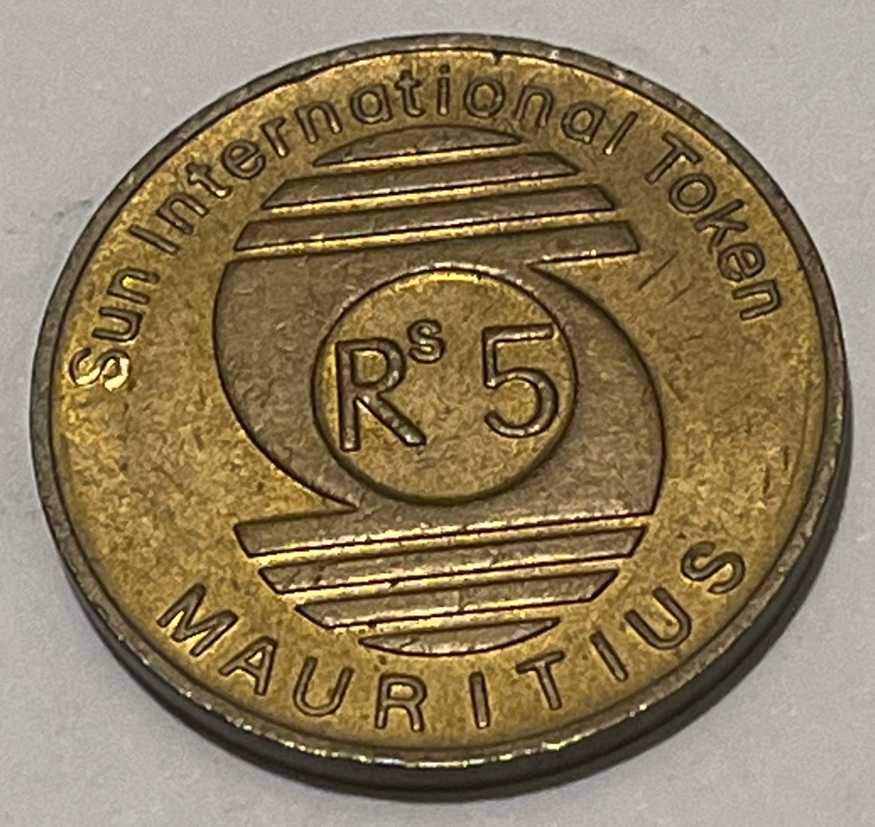 MAURITIUS, ND ~ 5 Rupee token AE26 ~ Sun International ~ Palm tree, sail boat ~ TC-253250 (2R), TC-180809 (10R), 5 Rupee unlisted