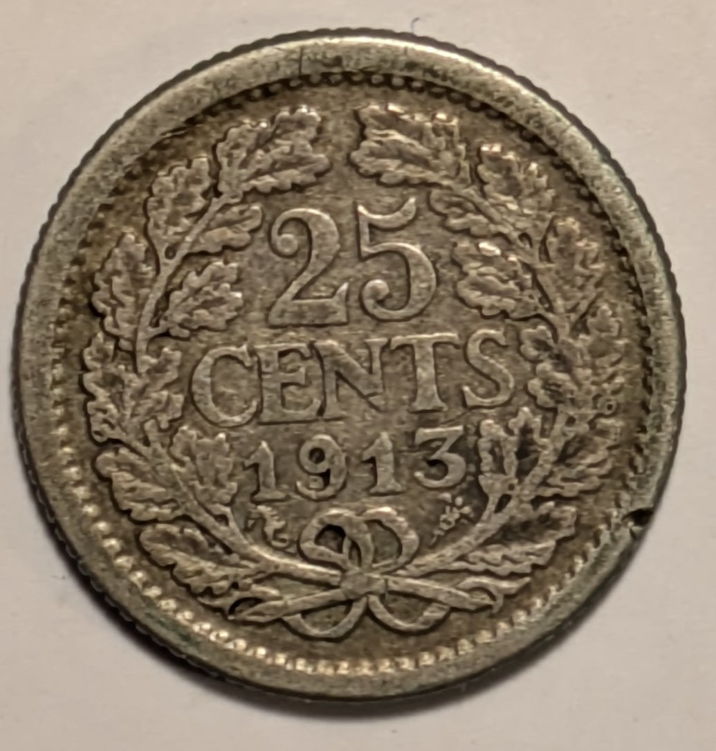 NETHERLANDS, Wilhelmina ~ 1913 ~ 25 cents ~ 3rd coinage, mature head ~ Y-40, KM-146 ~ Fine