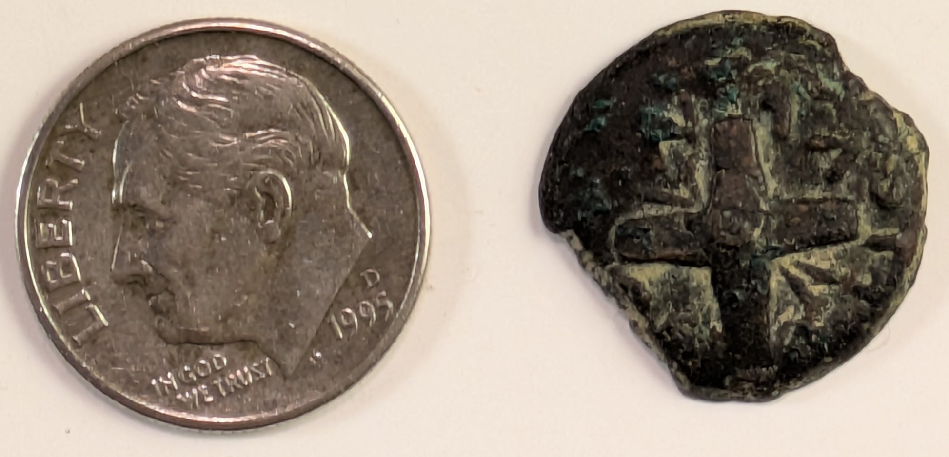 JUDAEA, Antoninus Felix, Procurator under Claudius ~ 52-59 AD ~ AE Prutah (2.66g) ~ Two oblong shields and two spears crossed ~ 6 branched palm tree, BPIT (for Britannicus, younger son of Claudius, LI△-1348, AJS-29 KAI = YEAR 14 ~ H-1348, AJC-29 ~ aVF