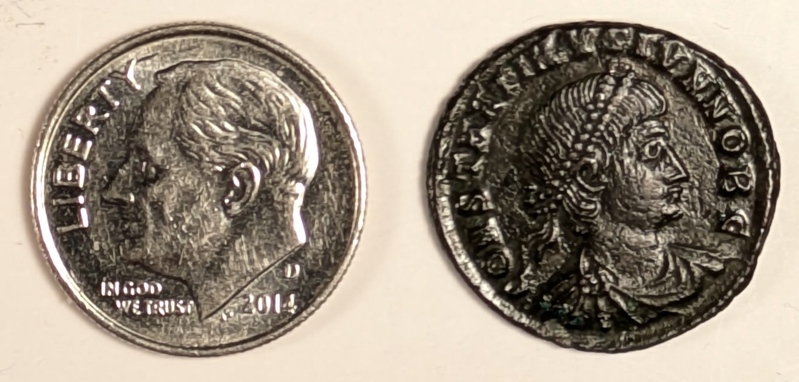ROME, Constantine II ~ 337-340 ~ Æ4 (2.49g) of Cyzicus ~ Bust right ~ 2 soldiers stg., either side of 1 standard, SMKA in ex, glor iaexer citvs around ~ RIC-27. LRBC-1275 ~ Nice glossy VF