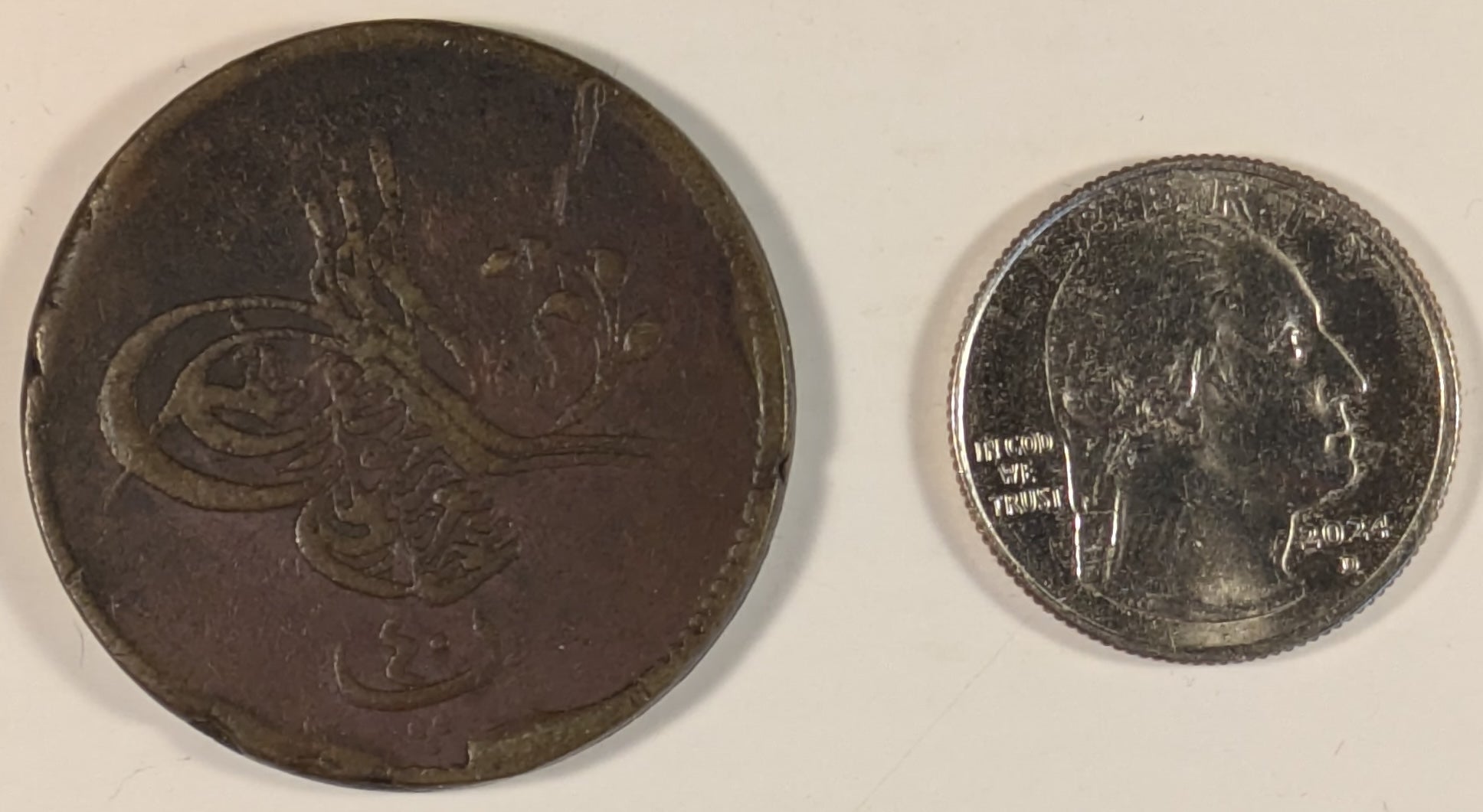 EGYPT, Abdul Aziz ~ 1277/10 (1870) ~ 40 Para ~ 36mm copper type, with rose at right. Struck in Cairo ~ Rough crude planchet which is typical of these Cairo mint products. Very rare. ~ Y-4a, KM-249 ~ F/VF