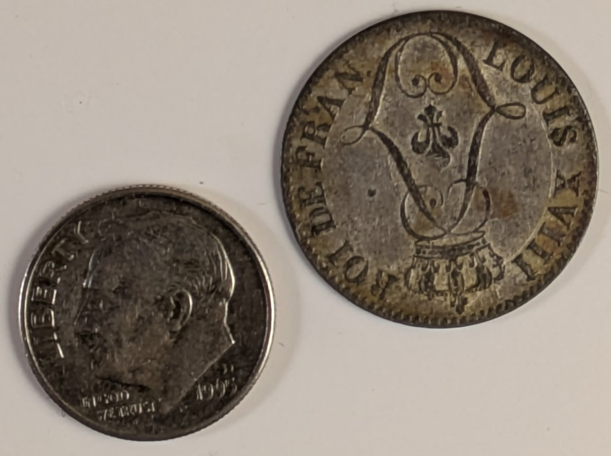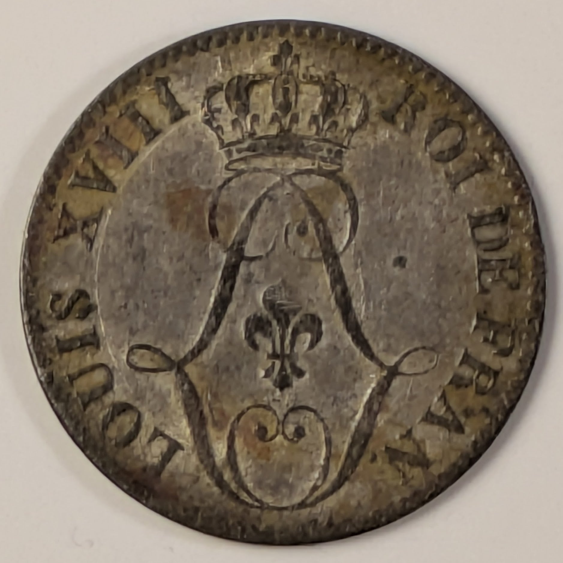 FRENCH GUIANA, Colony of Cayenne ~ 1818-A ~ 10 Centimes ~ 1 year billion type ~ Crowned monogram of Luis XVIII. High grade for this issue ~ KM-1a, CR-4, Lec-30 ~ Lustrous EF for type