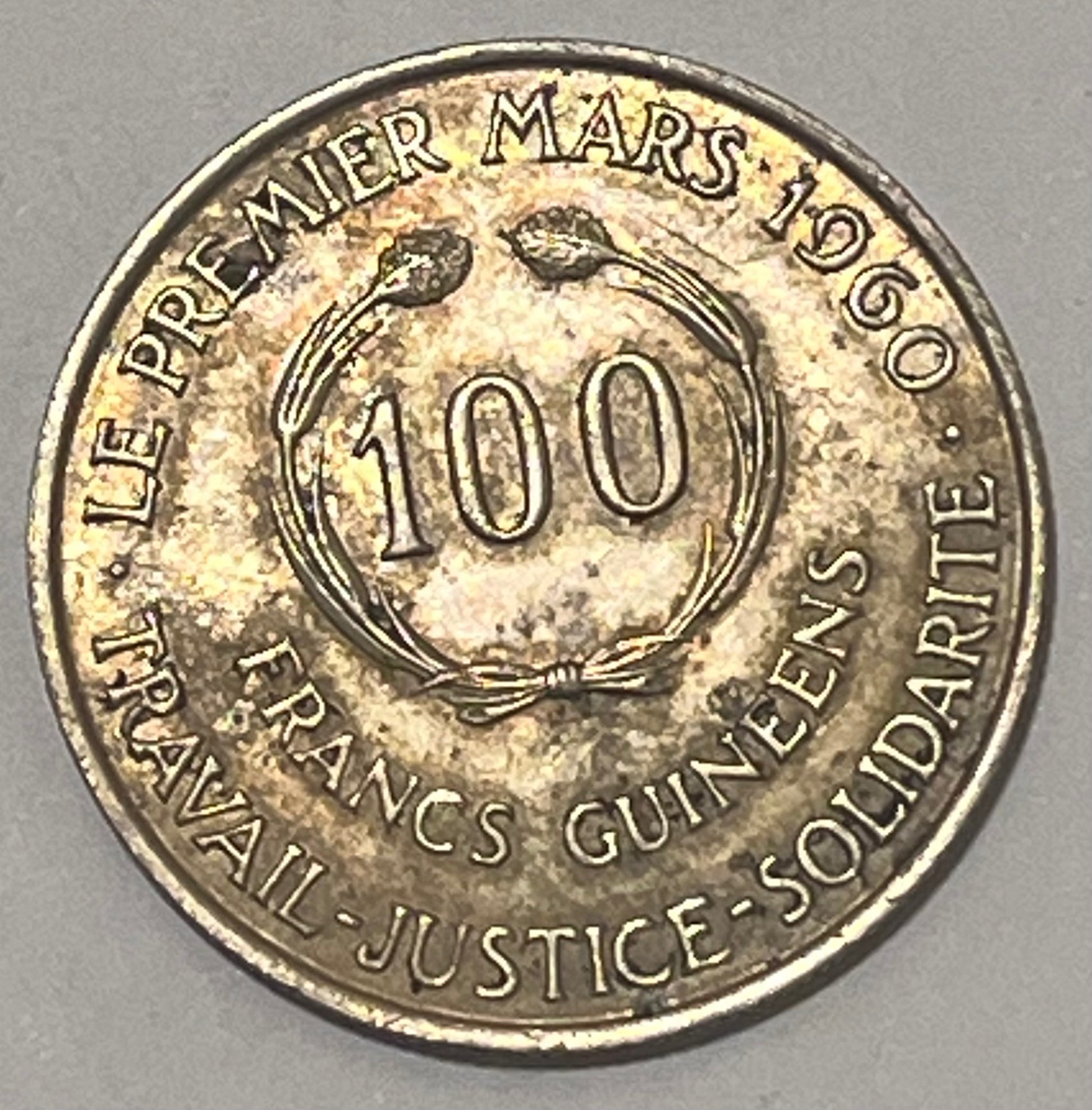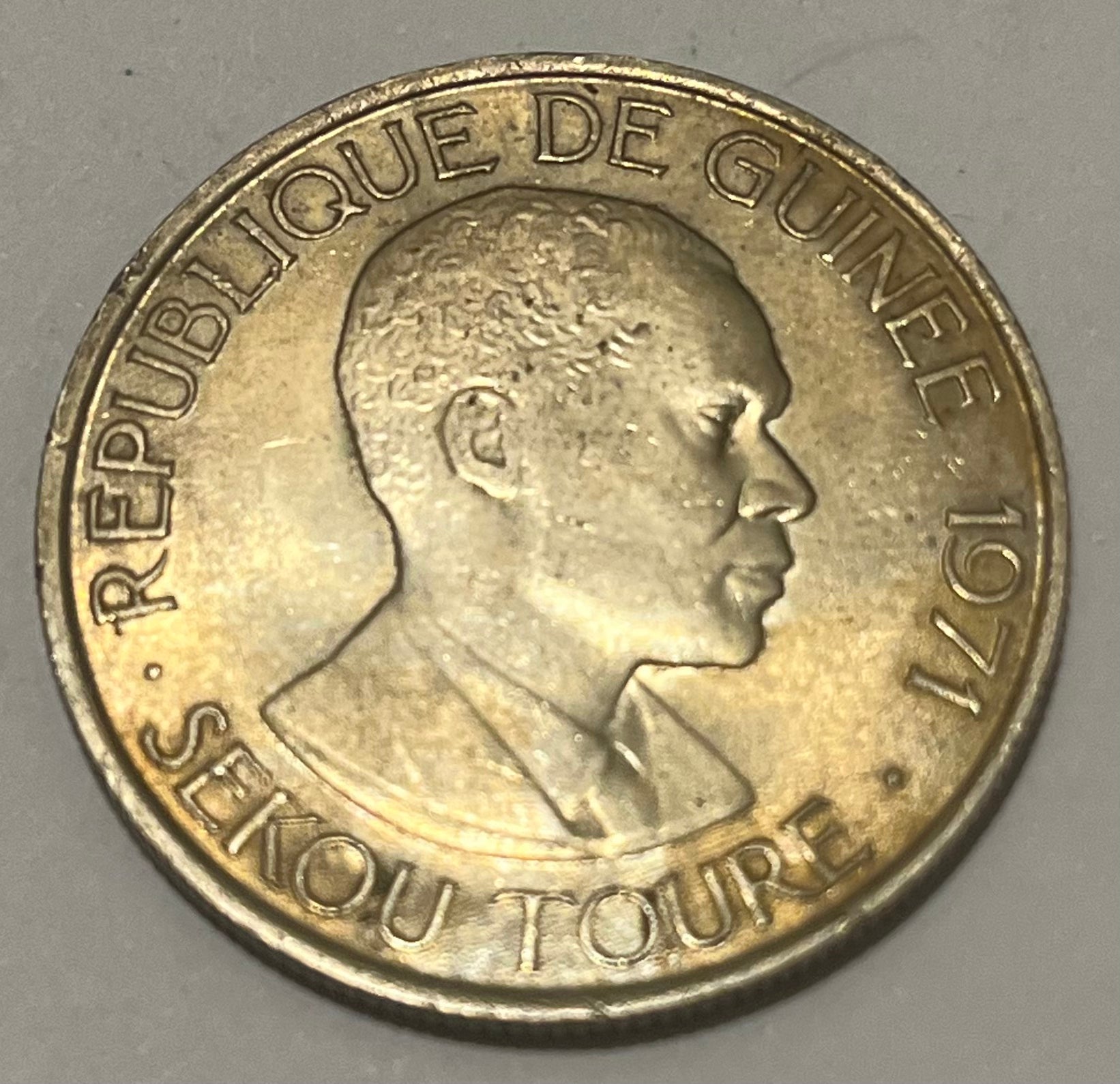 This copper-nickel piece was a non-circulating coin, struck by the Royal Mint (UK) the same year Guinea replaced the franc with the syli currency, which remained Guinea's currency until 1985.