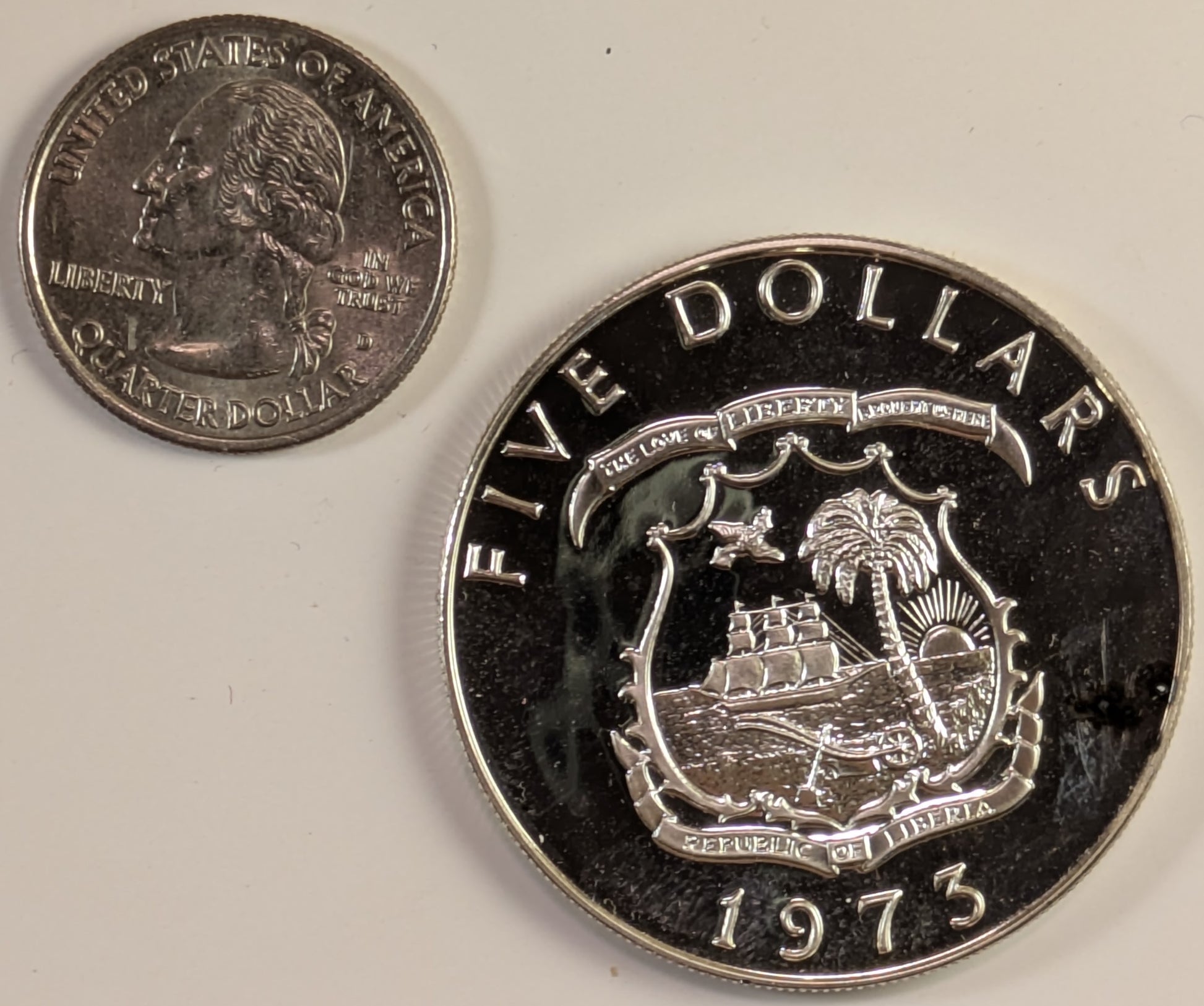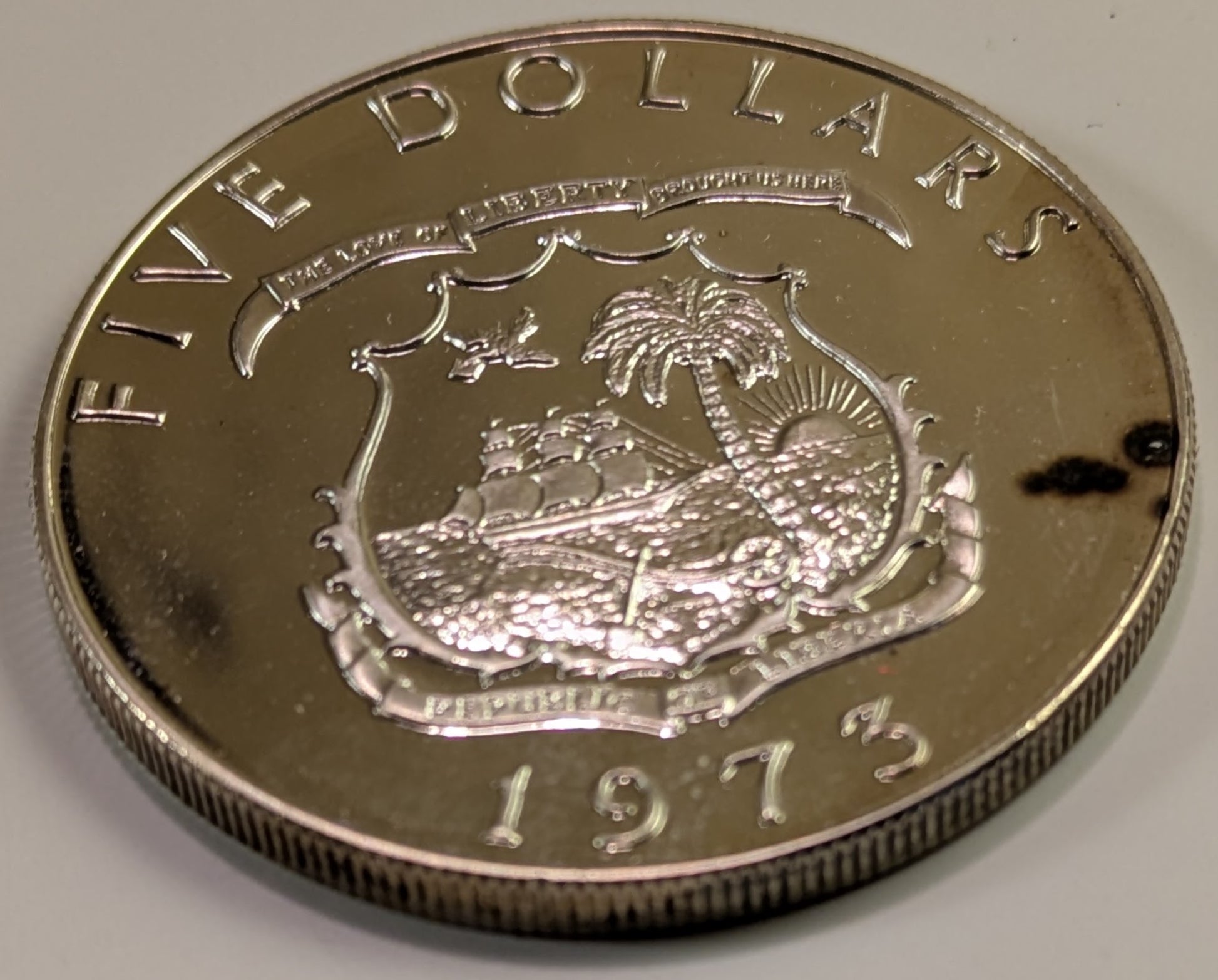 LIBERIA, Republic ~ 1973 ~ 5 Dollars ~ Elephant standing 3/4 right ~ Y-18, KM-29 ~ Ch. BU