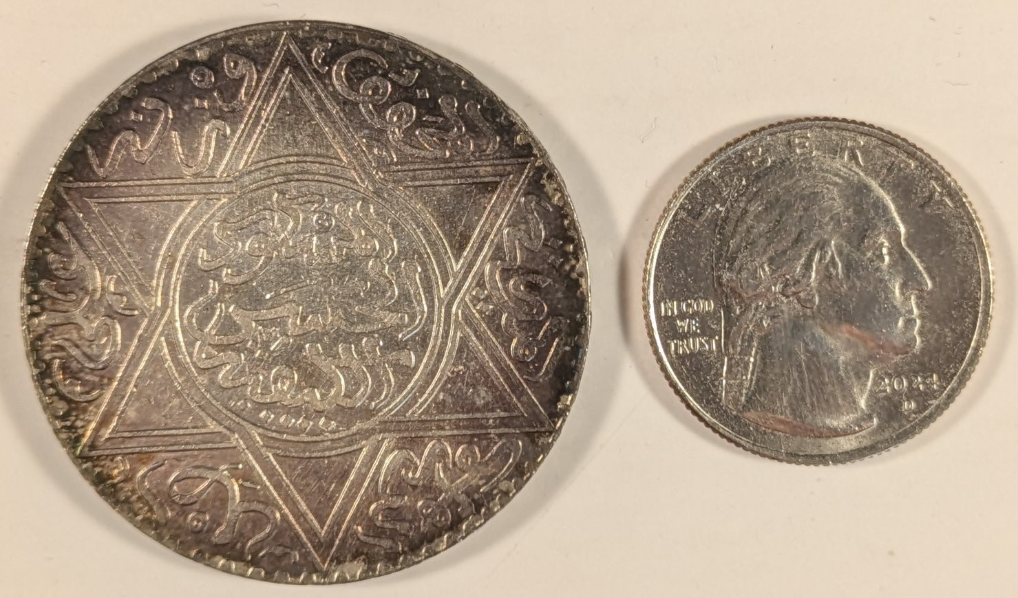 MOROCCO, Moulay al-Hassan I ~ AH 1299 (1882) ~ 10 Dirhams (1 Rial) ~ 1 year type, struck in Paris ~ Y-8, Dav-47, Lec-188 ~ Light toned EF-AU