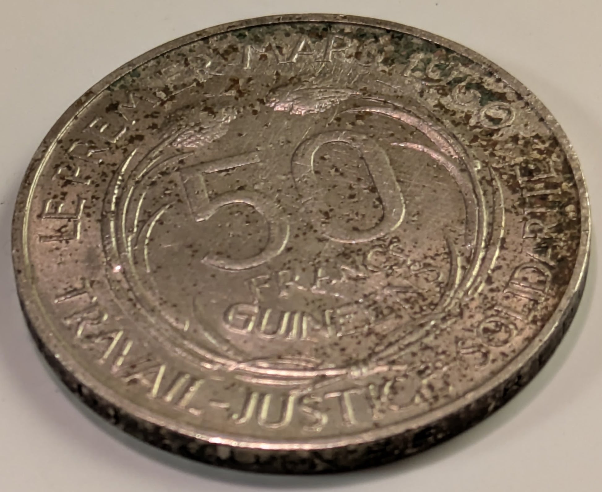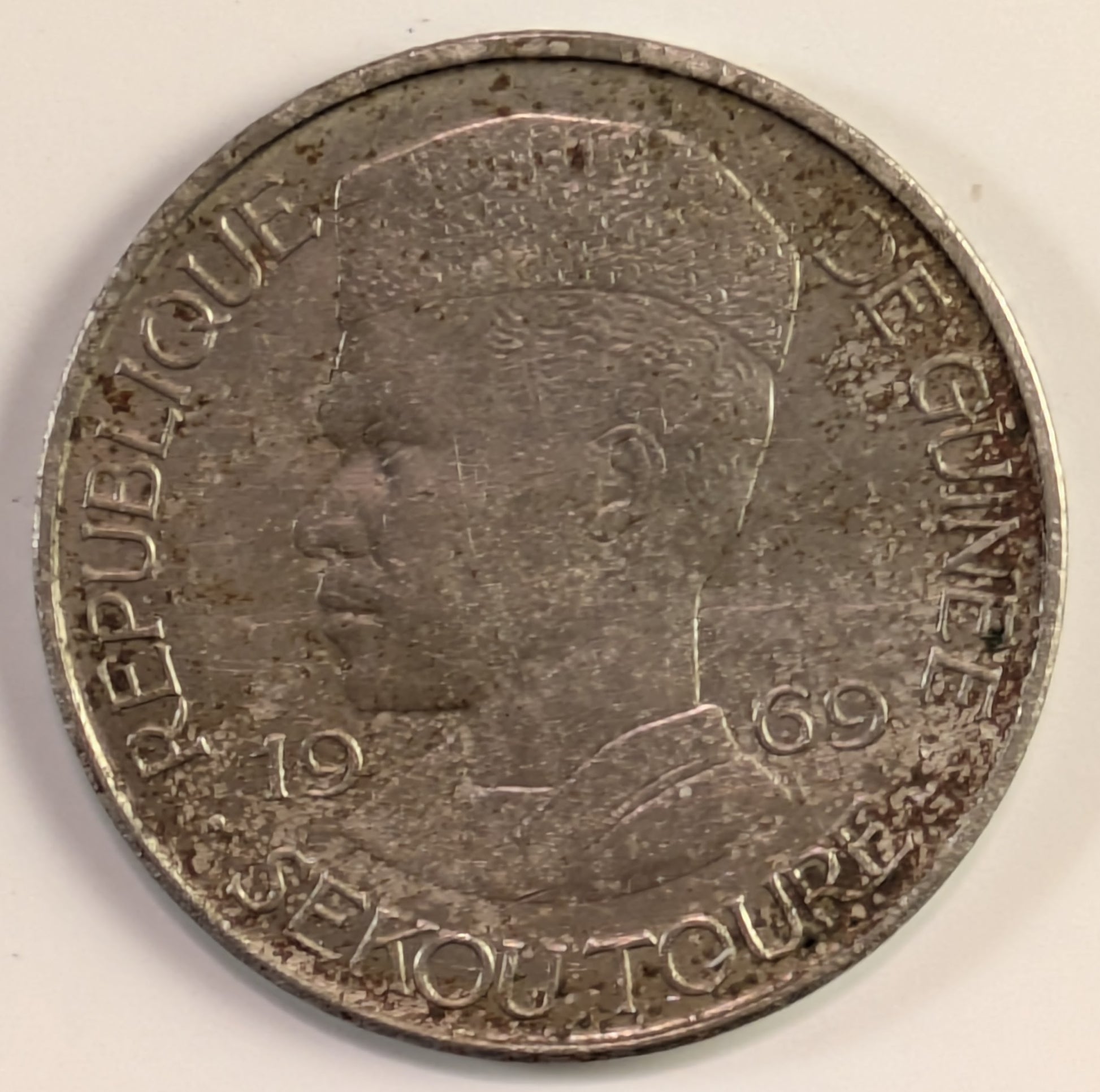 GUINEA, Republic ~ 1969 ~ 50 Francs ~ A type that was never released for circulation but obviously did circulate ~ seldom seen ~ KM-8, Y-8 ~ Toned EF ~ porosity