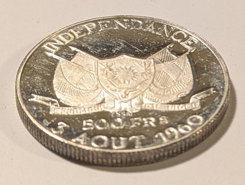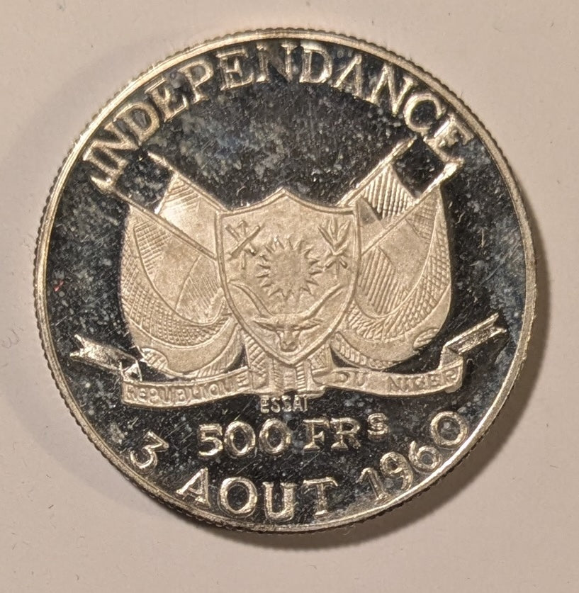 NIGER, Republic ~ 1960 ~ 500 Francs Essai ~ Independence Commemorative. Bust of Diori Hamani ~ Arms ~ 12/15 Kaapan & Mades offering one on MA shops for $190+ ~ KM-E5 ~ Choice Proof
