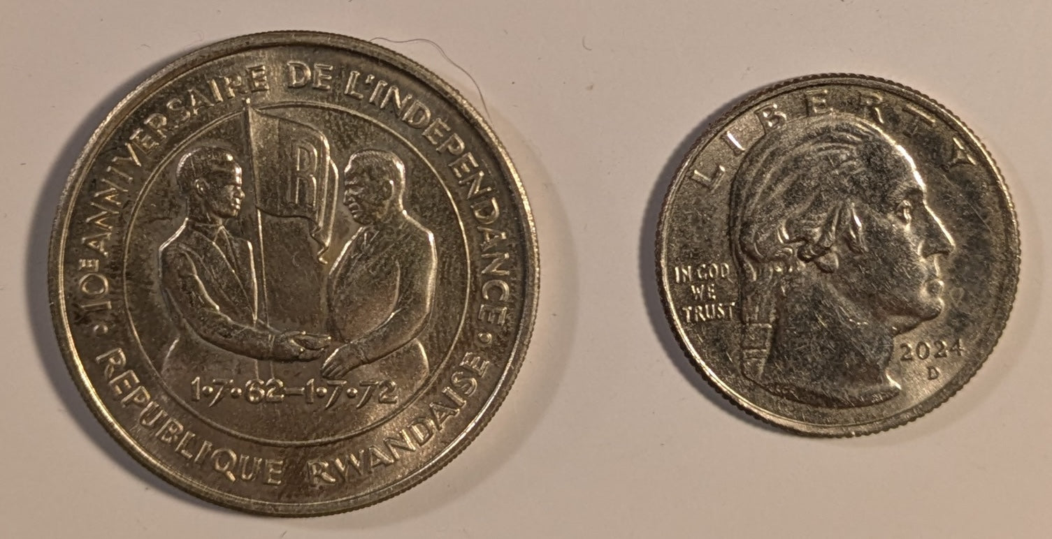 RWANDA, Republic ~ 1972 ~ Silver 200 Francs ~ 10th Anniverary of Independence. Gregoire Kayibanda, flag, dates ~ Figure picking coffee beans, FAO logo ~ Y-7, KM-11 ~ BU