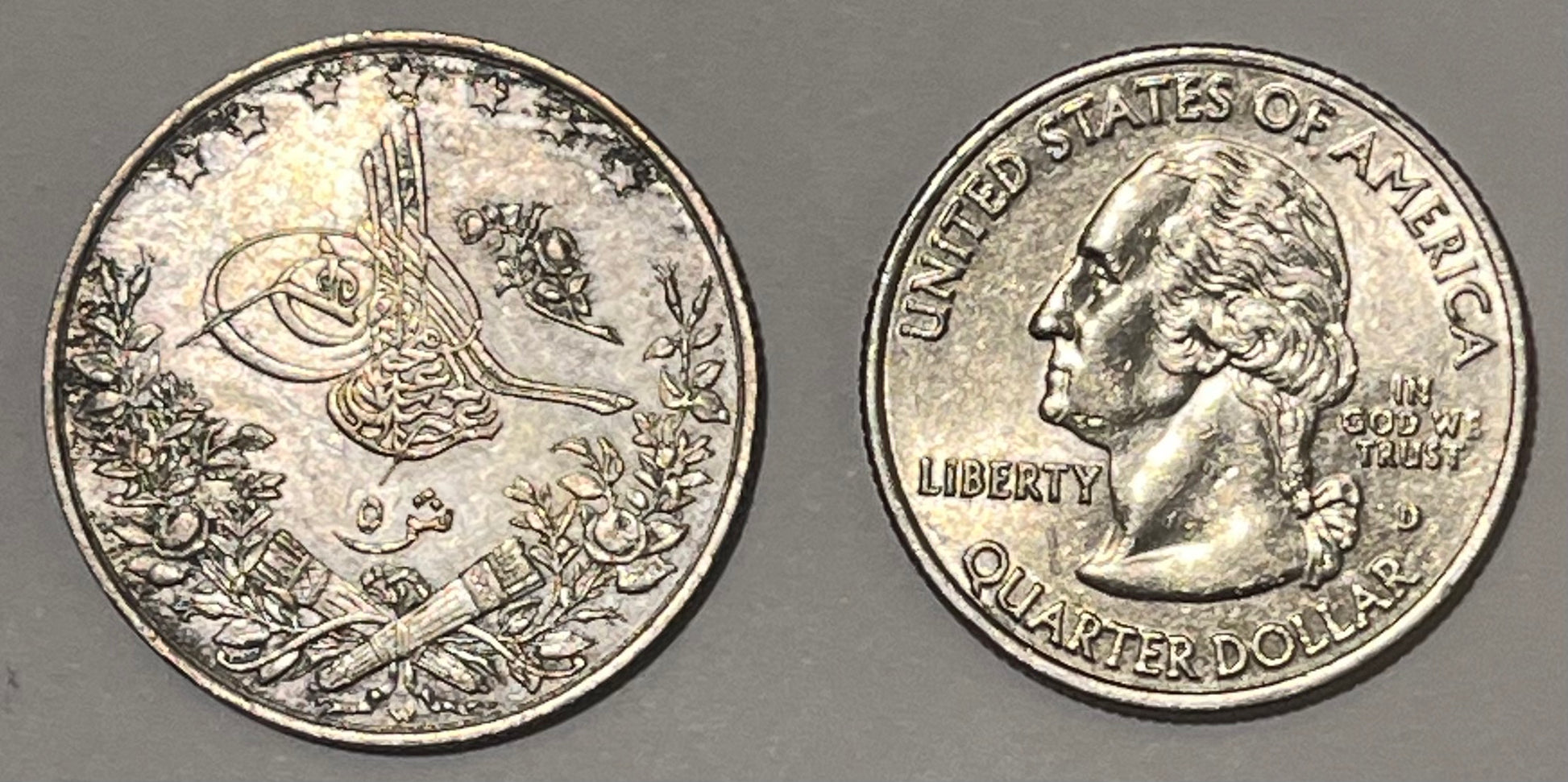 EGYPT, Abdul Hamid II ~ 1293/24w (1898-99) ~ 5 Qirsh ~ Toughra, denomination. W indicates engraved by Emil Weigand of Berlin ~ Legend, date, regnal year, "Misr." ~ Y-20, KM-294 ~ Toned Au-unc