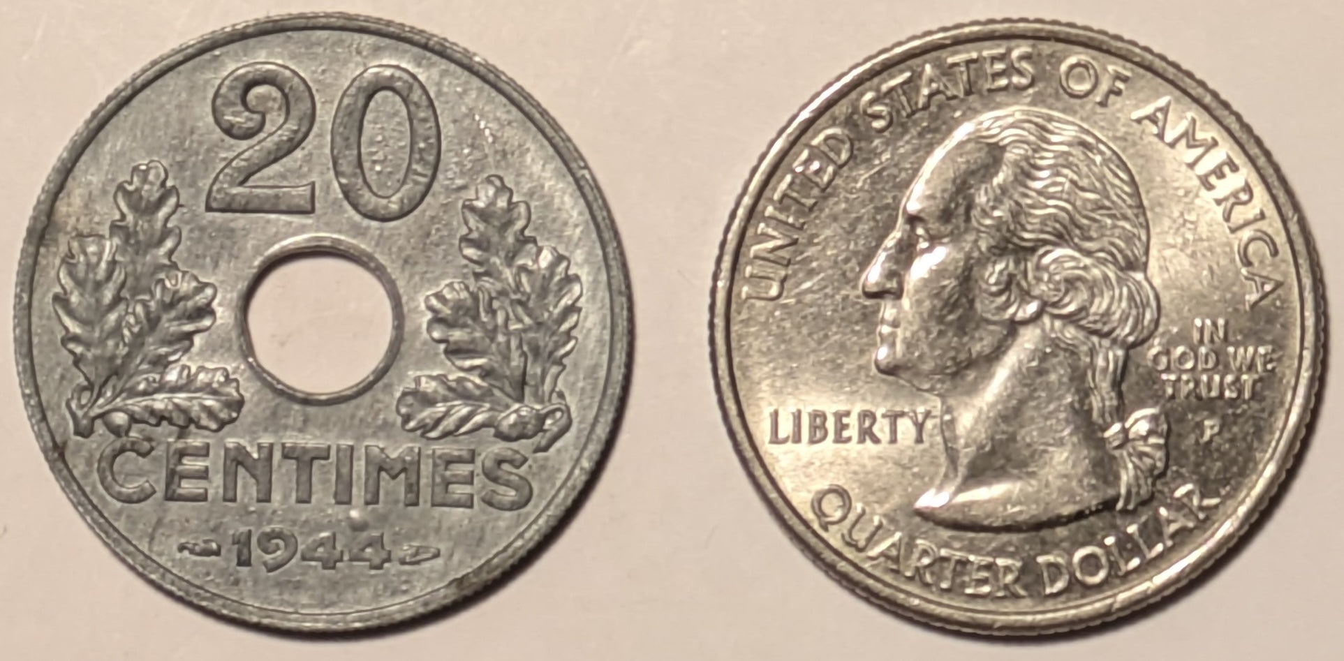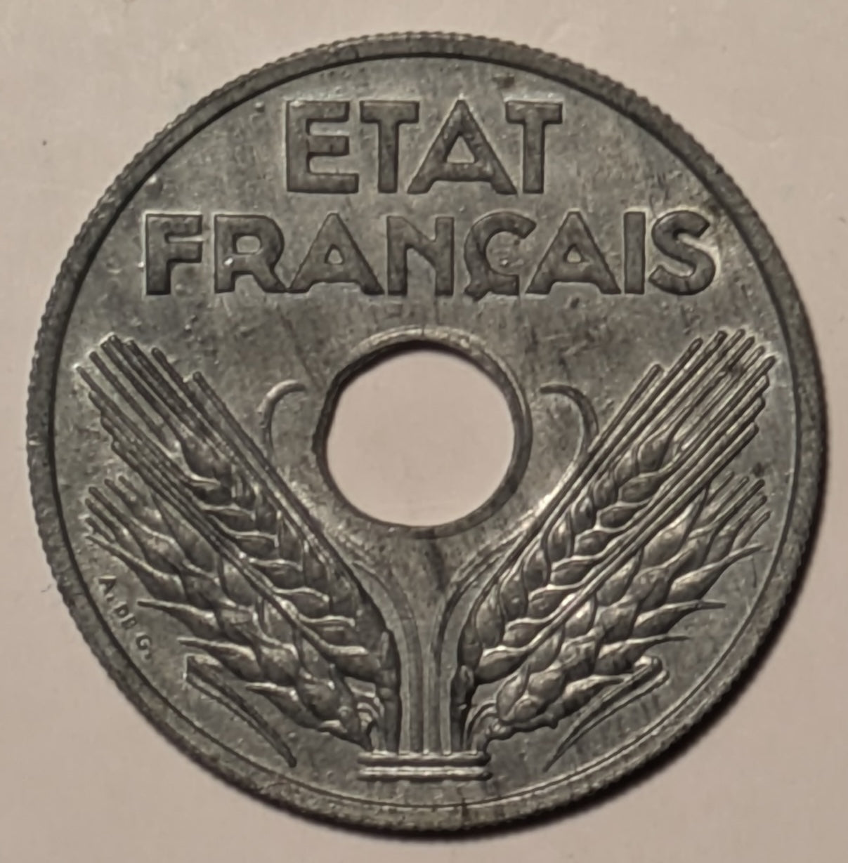 FRANCE, German Occupation (Vichy) ~ 1944 ~ Zinc 20 Centimes ~ World War II issue ~ KM-900.2, Y-V92 ~ Unc