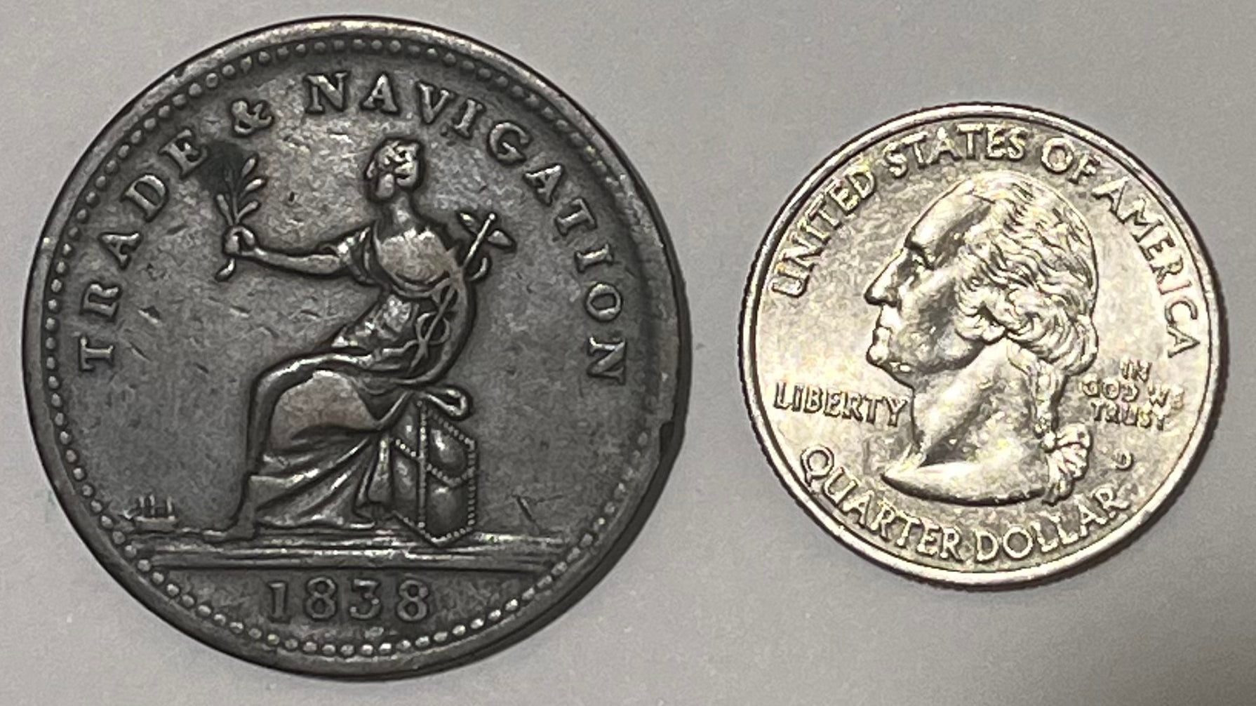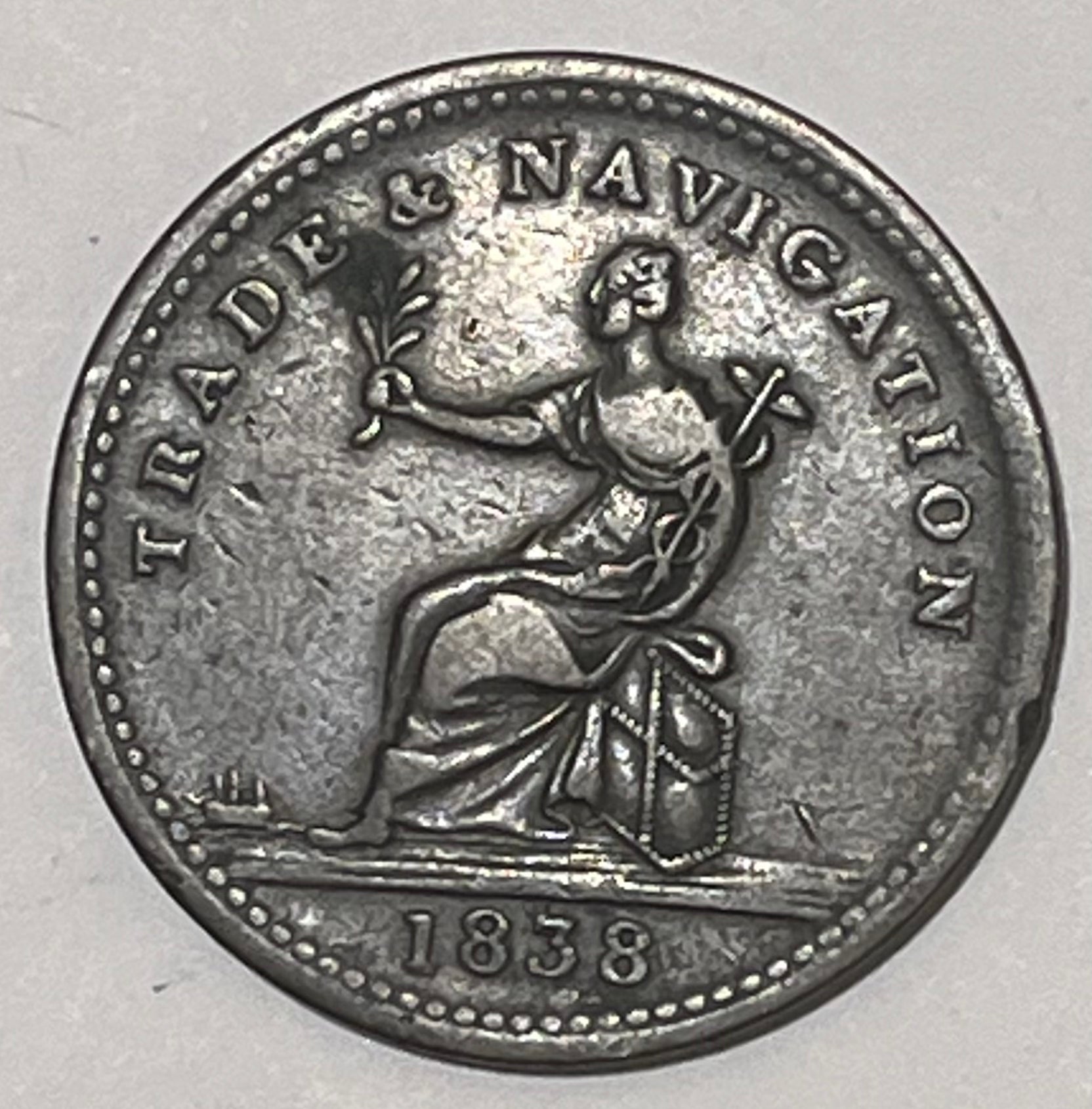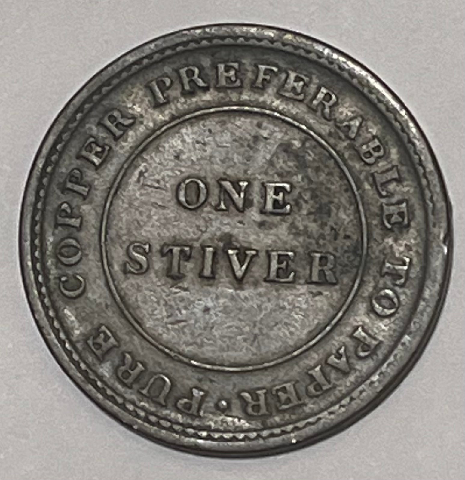 BRITISH GUIANA, Private Token Coinage ~ 1838 ~ Stiver ~ female seated on bale of hay left. Issued by Mr. Balgarmie a dry goods merchant ~ PURE COPPER PREFERABLE TO PAPER around 1 STIVER ~ KM-TN1, Pridore-60, Rulau ~ F-VF