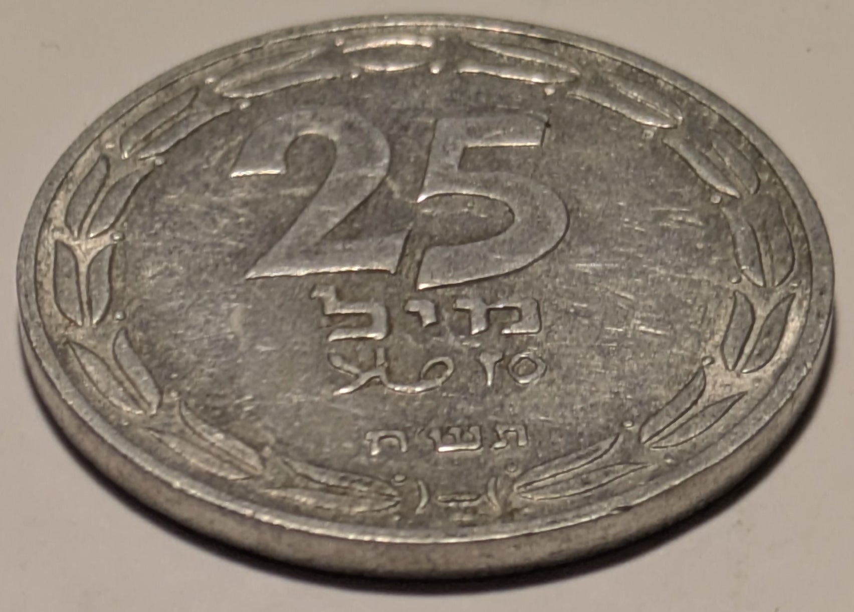 ISRAEL, Republic ~ 5708 (1948) ~ 25 Mils Aluminum ~ Only coin dated in Israel’s first year 5708 or 1948 ~ P-1, KM-8 ~ Toned VF-EF